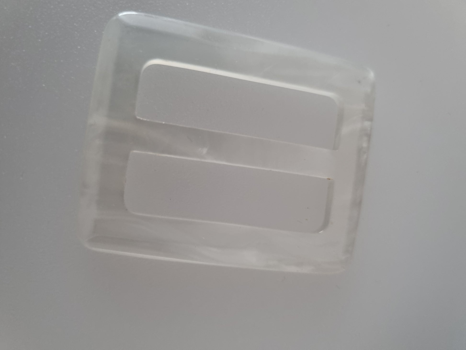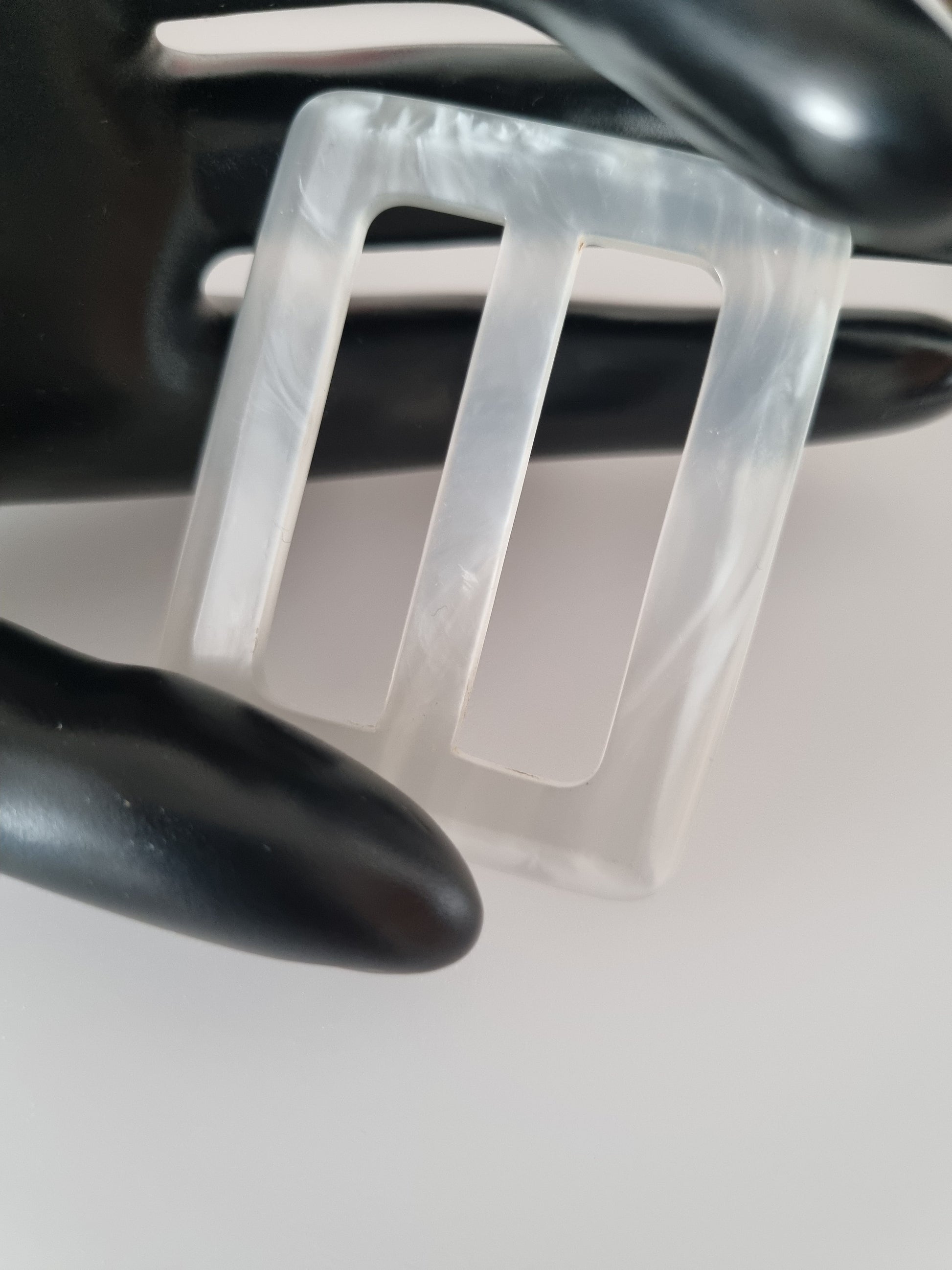 Description: Vintage Buckle Pearlised White. For Belts, Sewing, Scarves, Crafts. Pearlised white plastic buckle for bridal, formal, or vintage sewing projects.