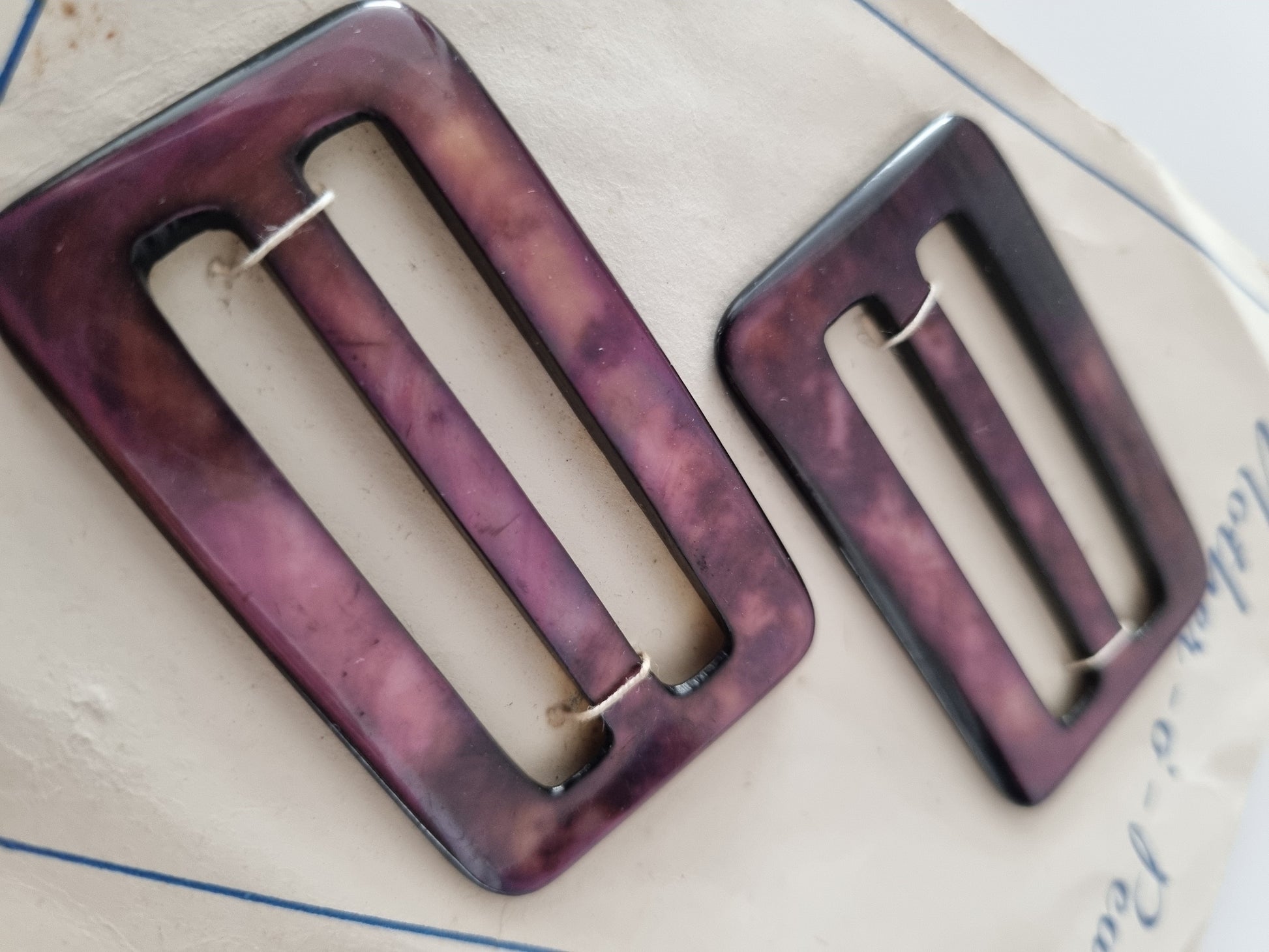 Description: Vintage Buckle Two Purple Mother of Pearl. For Belts, Sewing, Scarves, Crafts. Pair of purple mother-of-pearl look plastic buckles — unique and ideal for decorative vintage crafts.