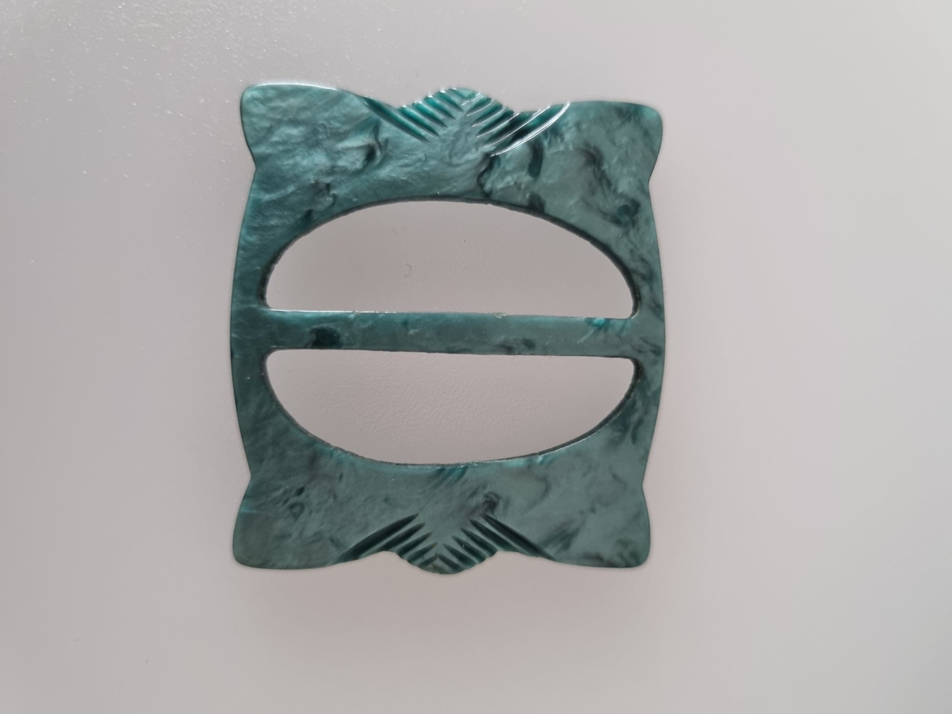 Description: Vintage Buckle Teal Blue Green. For Belts, Sewing, Scarves, Crafts. Teal blue-green plastic buckle — a bright and bold addition to craft or sewing kits.