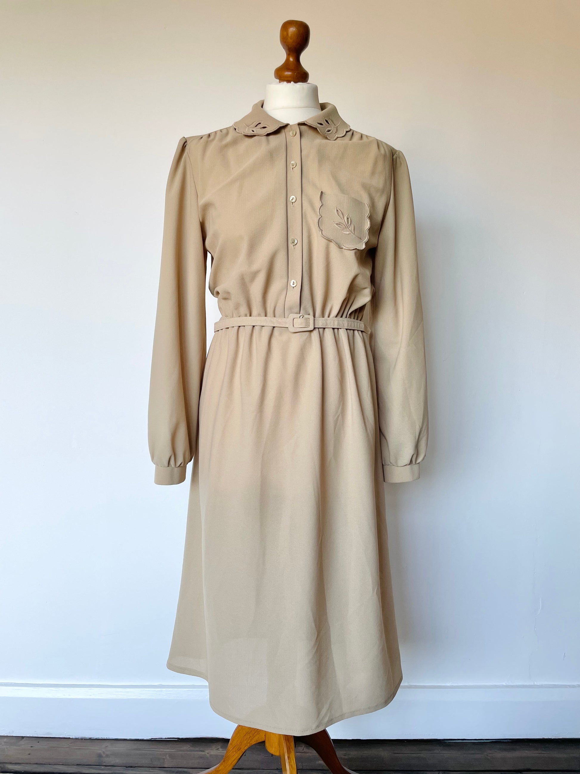 Vintage Richard Shops Beige Belted Long Sleeve Shirt Dress, a distinctive find for any vintage appreciator.