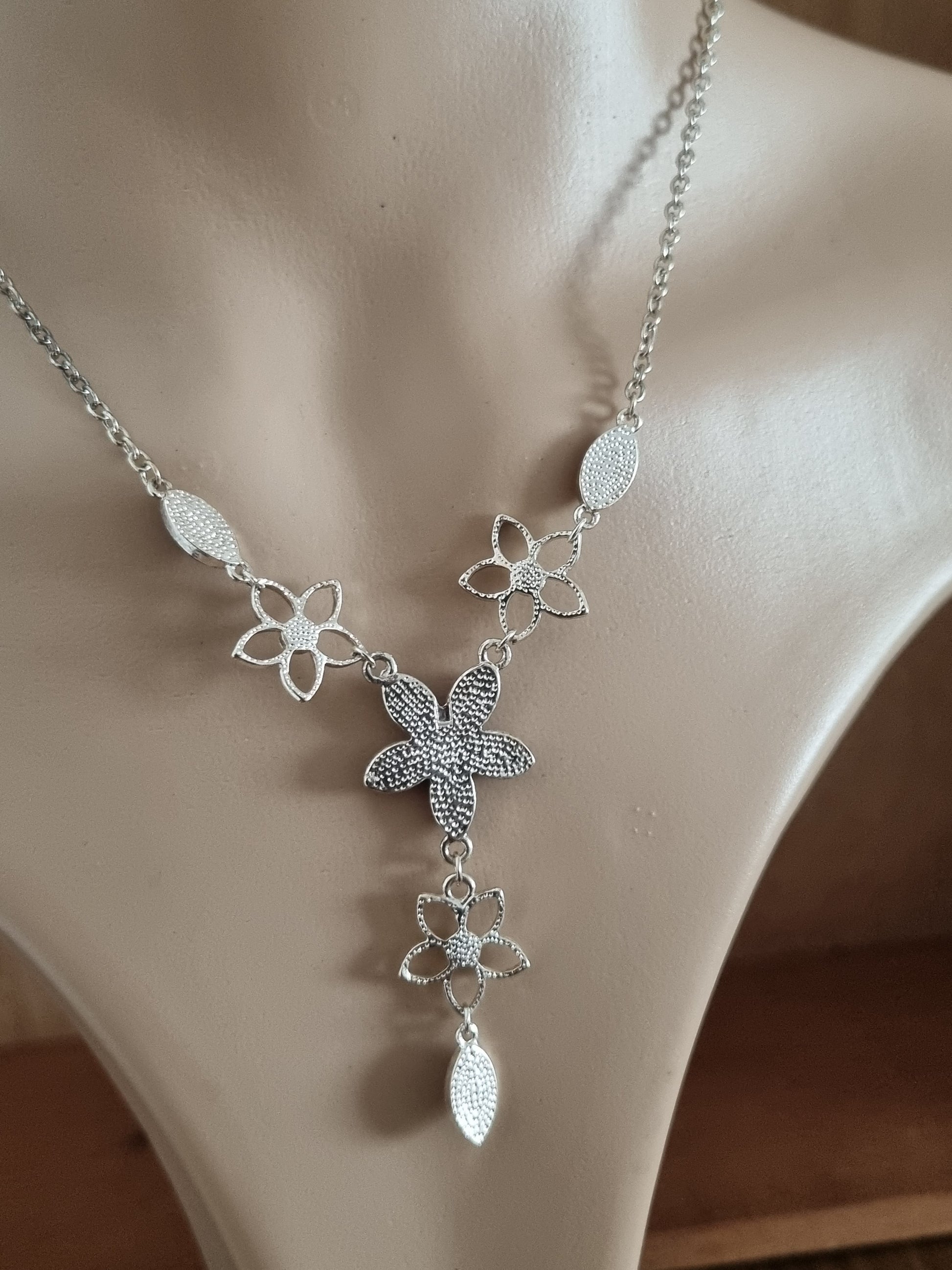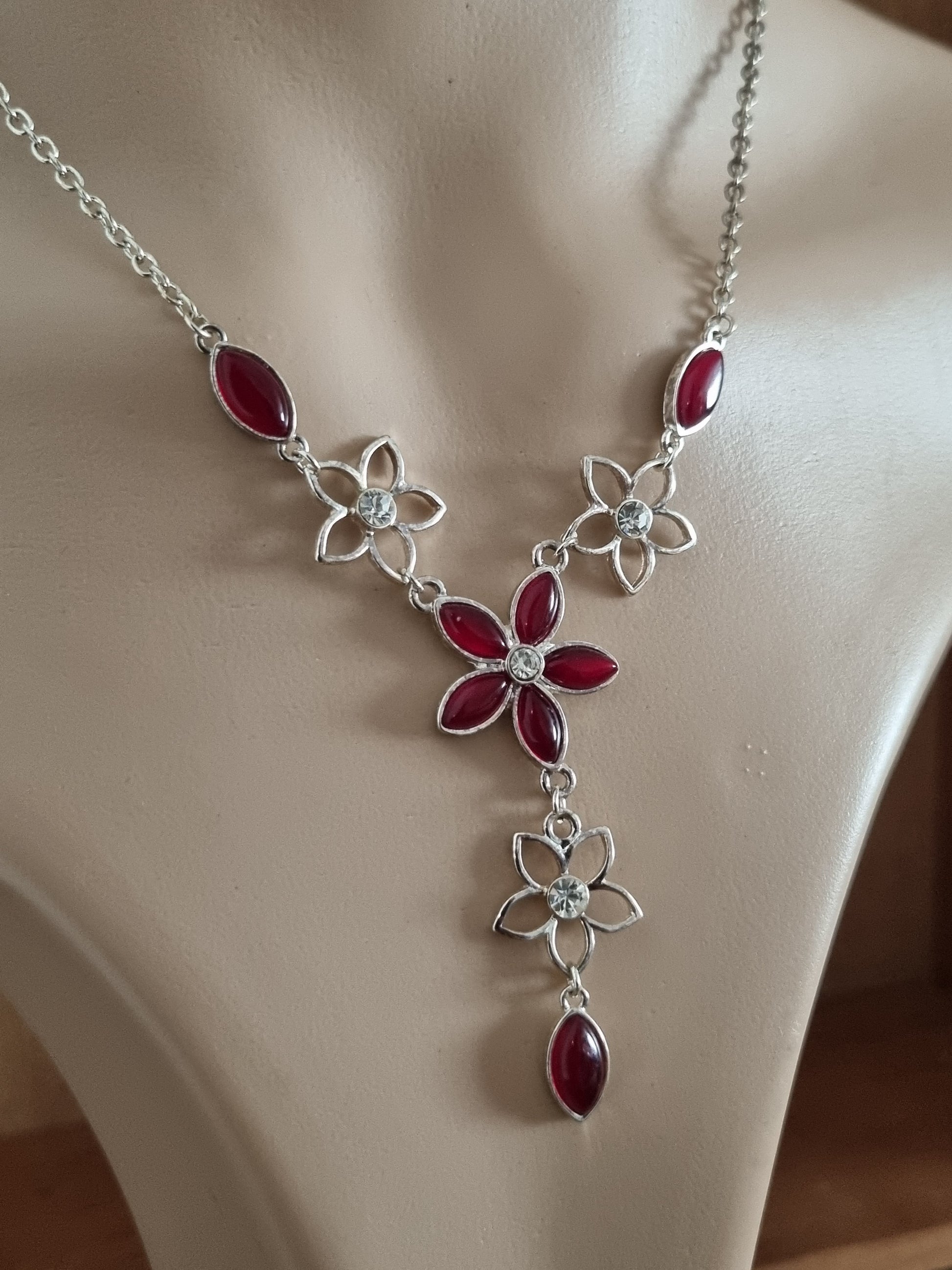Description: Vintage Necklace 90s Silver Tone Red Stones Floral Drop Pendant. Floral drop pendant with red stones in a silver-tone 90s setting.